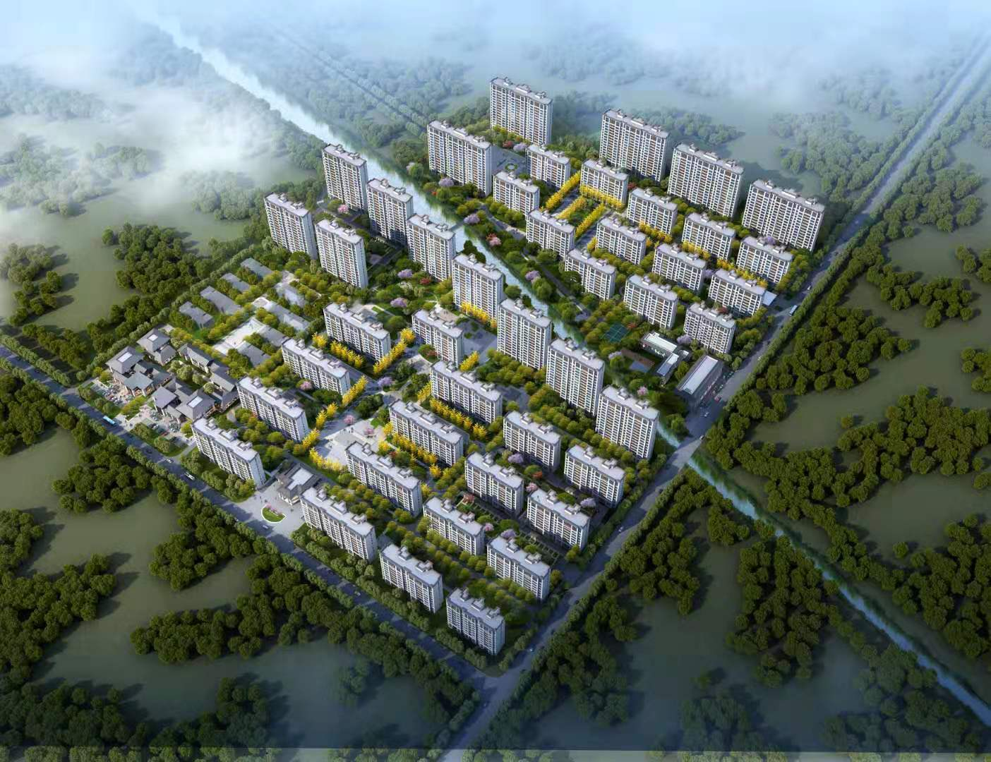 項目位于張家港大道東側(cè)、六塘河南北岸,主要包括14棟17層高層住宅,30棟10層高層住宅,1棟物業(yè)配套用房,一個幼兒園,組團商業(yè)以及地下車庫。項目方案總建筑面積約38.28萬平方米,其中地上建筑面積約30.89萬平方米,地下建筑面積約7.39萬平方米。住宅總戶數(shù)為2522戶,配套機動車位